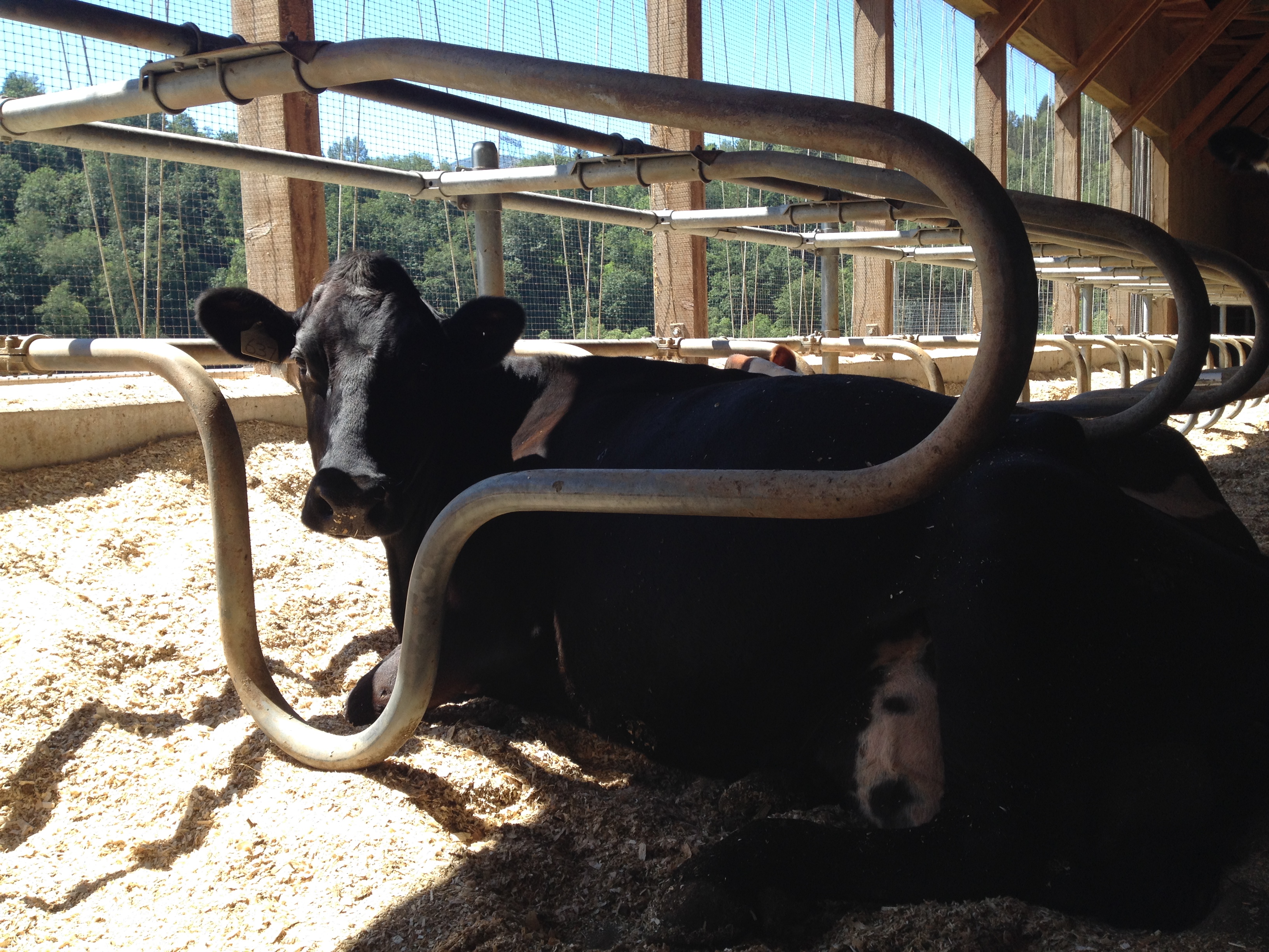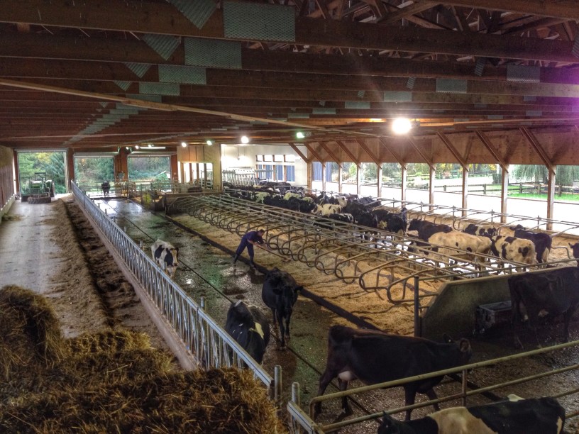 Near milking time, the cows start to gather around the milking parlour, eagerly anticipating the moment that we will open the gate allowing them access to the parlour. About half an hour before we are scheduled to milk, the parlour equipment that comes into contact with the milk is automatically washed and sanitized. This ensures that the equipment is sterile before contact with milk, keeping it safe for consumer consumption. Of course, milk is also pasteurized at the processing plant to totally eliminate the chance of milk-borne bacteria making a consumer ill. Once the gate is opened, the cows amble into the parlour. We always treat our cows gently and calmly, but this is especially important at milking time. Cows that are stressed or agitated will not allow their milk to drop, stress and agitation can block the milk let-down reflex. A cow that is not milked out properly will experience pressure and fullness in her udder before she is due to be milked again. Repeated episodes of improper milking may lead to an infection of the udder, mastitis. Therefore, both we and our employee know that cows must be handled in a calm and quiet manner during milking. Our cows are accustomed to our parlour layout, and align themselves at a 45 degree angle to the parlour pit. Our parlour is laid out in para-bone style, a cross between parallel (milking between the back legs) and herringbone (milking from the side of the cow) styles. We attach the milking unit between the cow’s hind legs. When the cows have all moved over into the waiting area in the alley behind the milking parlour, we take a scraper and clean the manure or wet sawdust out of each stall, and spread more sawdust from the pile at the front of the stall into the area where the cows lie. We want our cows to be comfortable while they’re lying down producing more milk, and overall cow health is improved when cows lie comfortably as well.