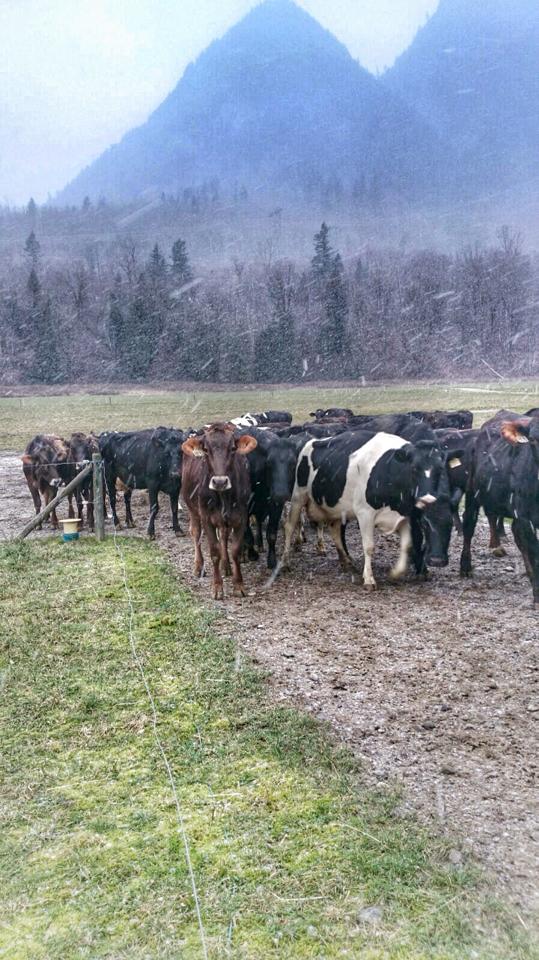 Yesterday, the absurdity of these claims struck me once again. It was time for our regular “changing of the girls’ sheets”, aka putting a new, fresh layer of aromatic and soft wood shavings in the cows’ stalls. Because the weather has been quite dry for a few weeks, we’ve been able to allow the girls some outdoor access, and so yesterday was a prime time for them to get out to stretch their legs while we gave them new bedding. After we were done with bedding, we opened the barn gate. The girls ignored us and stayed out in the paddock, enjoying the fresh air. But less than 15 minutes later it began to snow lightly. I watched with interest: for many of our girls, this was their first experience of snow, so how would they react? Our mild West Coast winters mean that snowfalls here are very few and far between. Our cows weren’t quite sure what to make of this white stuff! As the snow began to fall more thickly, the wind began to whip around the corner of the barn, causing me to shiver in my thick barn coat and I wasn’t surprised to see our ladies make their way rather quickly into the barn. I smiled as I watched many of them make their way to the stalls, settle down into the soft and fluffy new bedding and begin chewing their cud contentedly, while others headed off to the feed bunk to munch on their ration of corn silage, grass silage, hay and grains. It was so very obvious to me that our cows love their barn and enjoy spending time there!